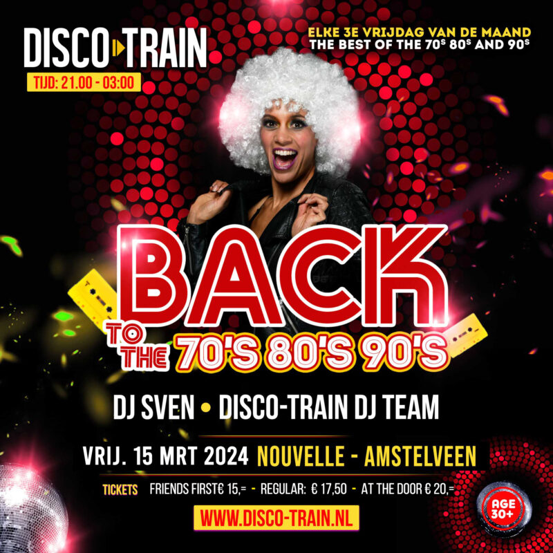 | Elke 3e vrijdag tref je de Disco-Train in Club Nouvelle met muziek uit de jaren ’70, ’80 en ’90, uit de tijd van AVRO’s Top-Pop en Veronica’s Countdown. De beste DJ’s draaien die discokrakers waarop je niet stil kunt blijven staan. Maar ook de enorm in opkomst is de muziekstijl "Nu Disco", waarbij nummers van toen gedraaid worden in een modern jasje. Gratis hapjes Gratis warm buffet Gratis parkeren Gratis toiletten & garderobe |